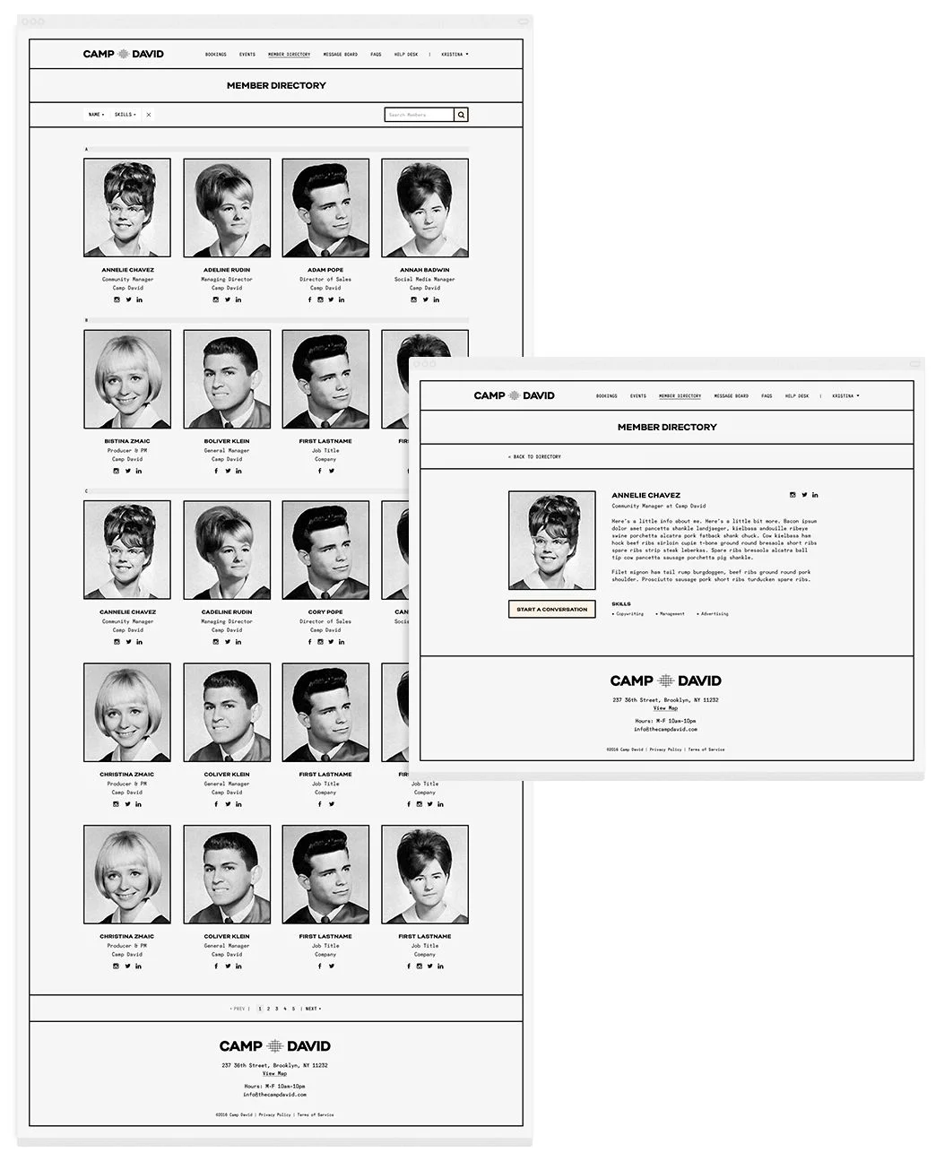 The Camp David branding was developed by Base Design. Working within their brand guide, I created print materials and collateral for the space. Pale peach letterheads, custom folders, and thermographic printed business cards all come together to give the timeless, tactile feel of the Camp David brand.