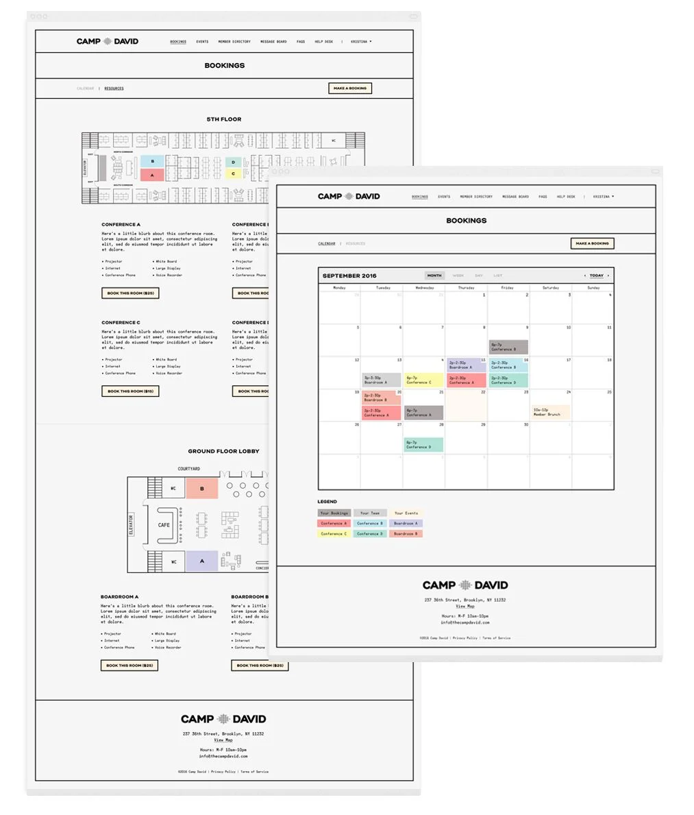 Camp David has three floors, so booking various conference rooms becomes a bit complex. The bookings calendar has a "Resources" tab to allow members to have a visual of the floor plans and book conference rooms for each floor – or revert to the calendar view.