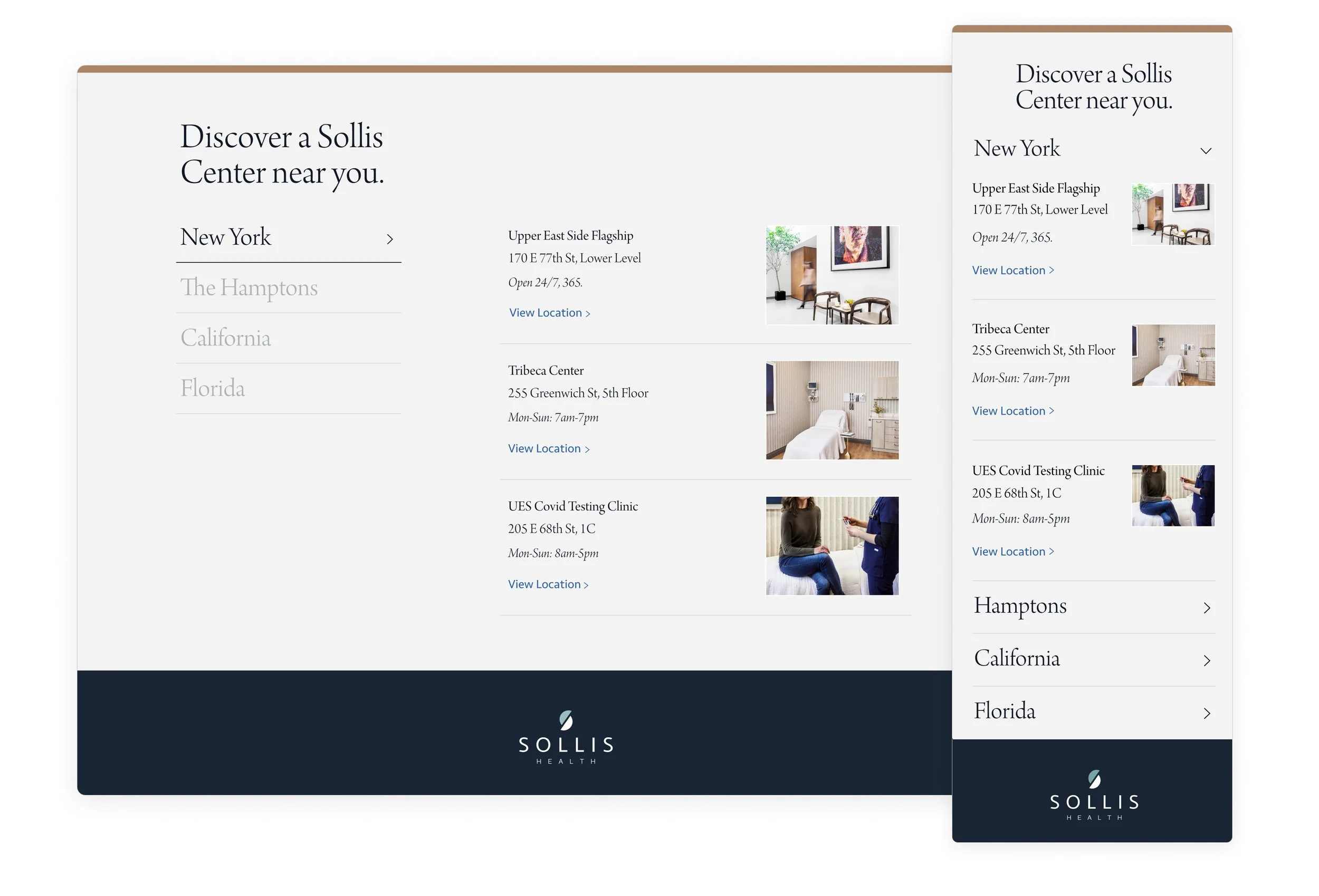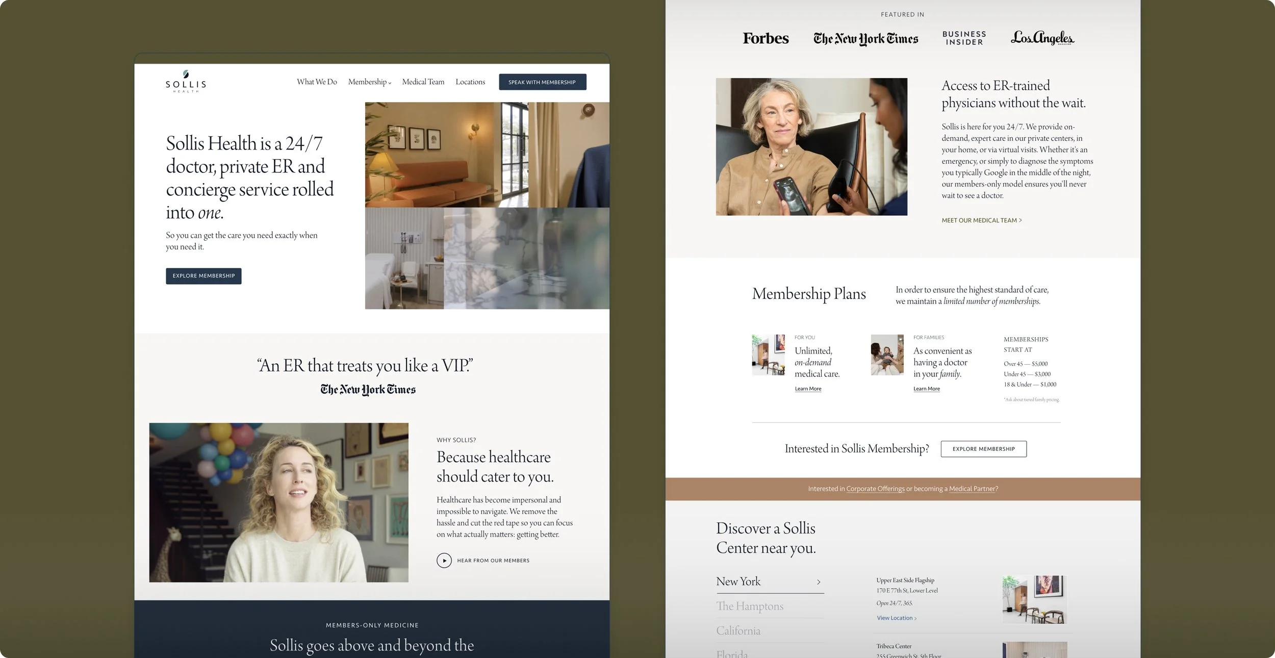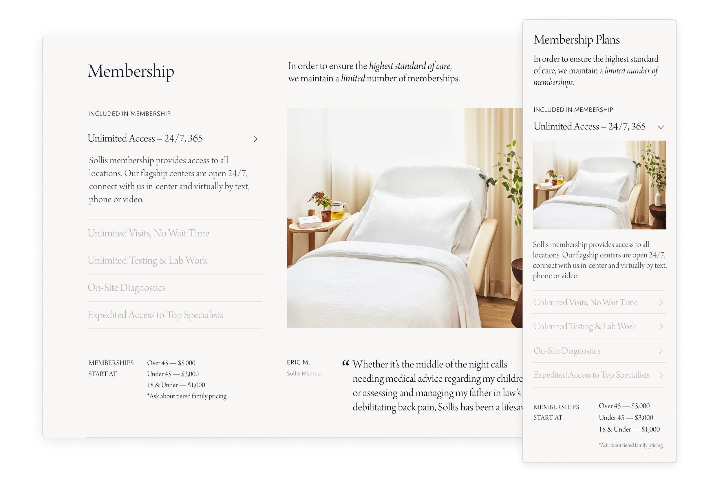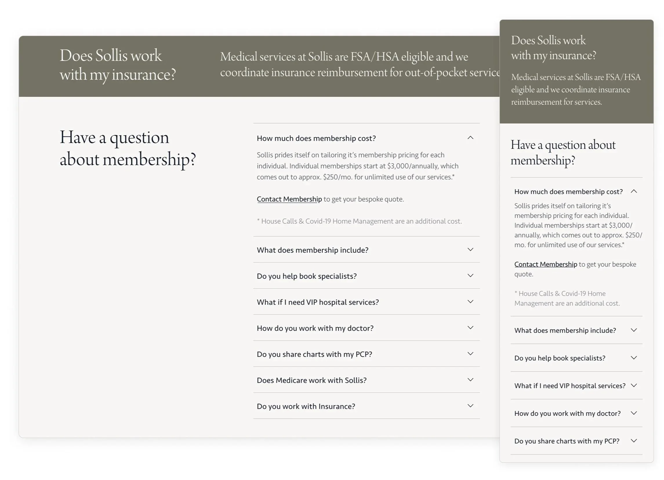 Based on my research, I ensured that the site spoke to real-life reasons why you’d need Sollis in your life. I also created transparency around membership and pricing, answered common questions about insurance coverage, and highlighted locations with details about the doctors.