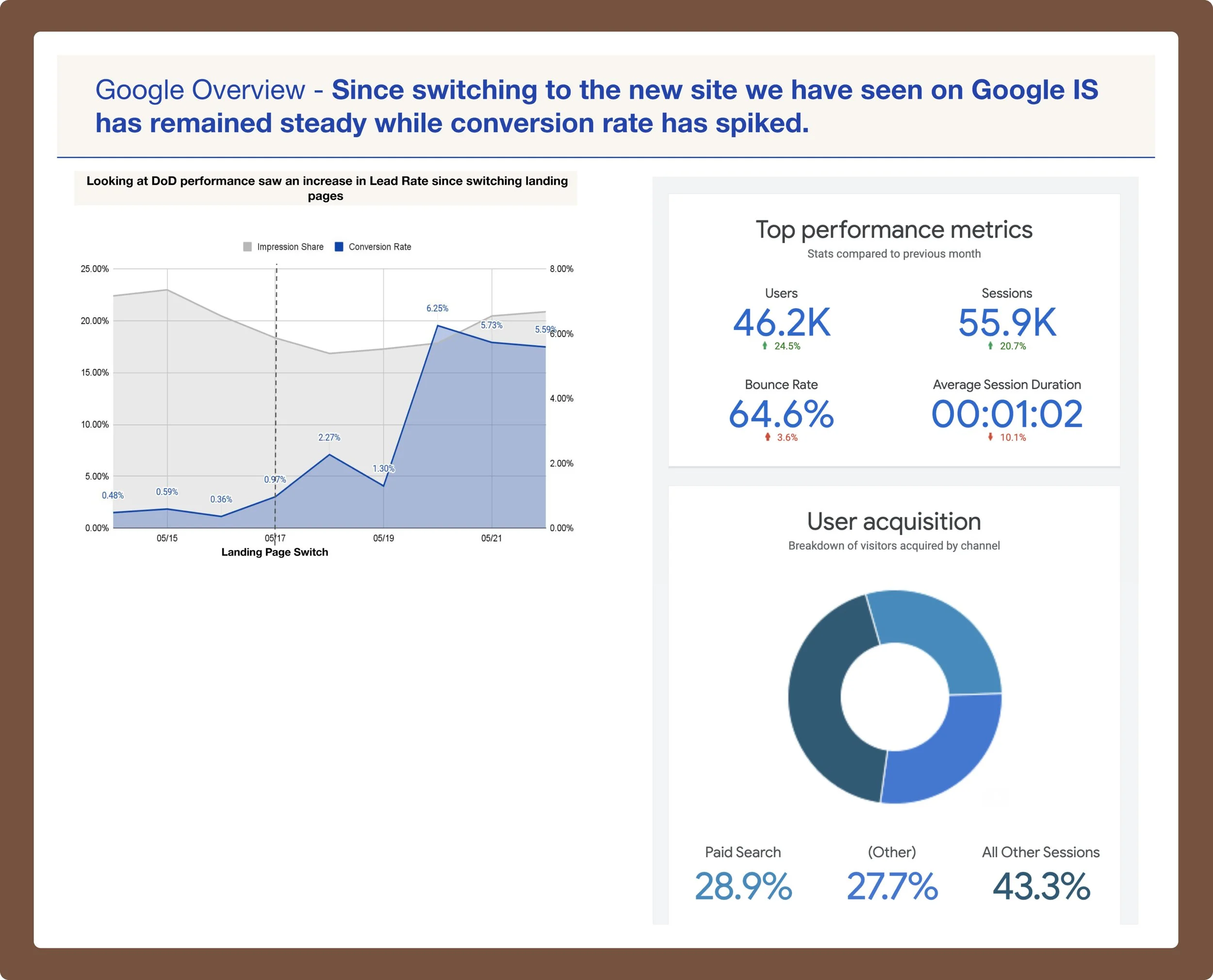 The redesigned site 3x’d daily revenue day of launch, increased conversions by 540% within 3 days, and cut form drop-offs from 90% to just 3% while fueling month-over-month traffic growth, with users up 24.5% and sessions up 20.7%.